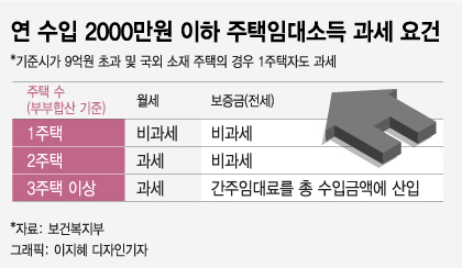 2주택자의 경우 월세 수입에만 건보료를 부과하고 보증금에는 부과하지 않는다. 월세가 아닌 전세만 놓는 사람이라면 건보료를 내지 않아도 된다. 3주택 이상 다주택자의 경우 월세 수입과 보증금(간주임대료)에 대해 건보료를 부과한다.
