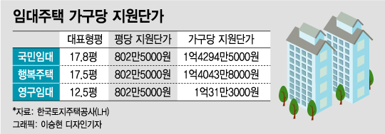 임대주택 지원단가는 주택 유형과 상관없이 3.3㎡당 802만5000원으로 묶였다. 주택 유형별 평균 공급면적과 3.3㎡ 단가를 곱해보면 가구당 평균 단가는 영구임대 1억31만원, 행복주택 1억4043만원, 국민임대 1억4284만원이다. 단가의 70%는 정부 출자와 주택도시기금 융자로 충당하고 있는 만큼 면적을 넓히려면 예산 투입이 필수다.