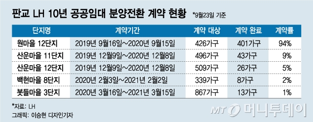 한편 주택가격 급등으로 입주민들과 갈등을 겪는 판교 내 다른 10년 공공임대주택 분양전환 대상 단지들의 계약률은 아직 높지 않은 편이다. 분양전환까지 기간이 남은 등의 이유 때문으로 보인다.