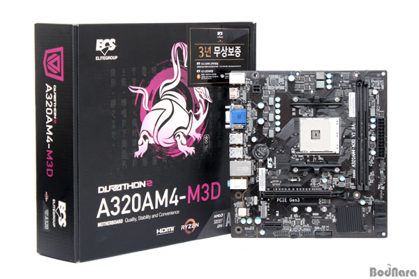 ECS DURATHON2 A320AM4-M3D는 무려 3년 전에 보드나라에서 리뷰했던 1세대 라이젠 프로세서 지원 A320 메인보드다. 당시 가성비 좋은 보급형 A320 mATX 메인보드로 출시되어 사랑을 받았다.