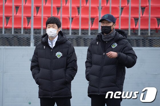 | 박지성 전북현대 어드바이저(왼쪽)와 김상식 전북 감독이 22일 남해 스포츠파크에서 훈련을 지켜보고 있다.(전북현대 제공) © 뉴스1 |