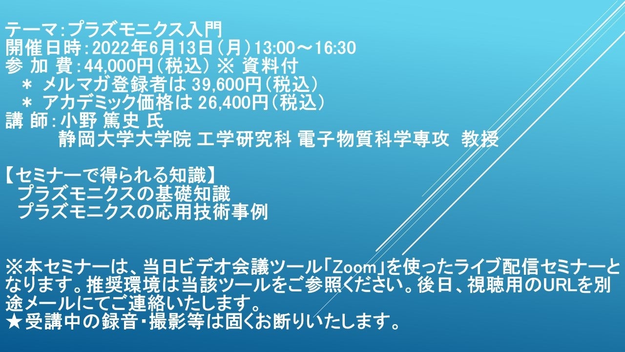※ 本セミナーは、当日ビデオ会議ツール「Zoom」を使ったライブ配信セミナーとなります。推奨環境は当該ツールをご参照ください。後日、視聴用のURLを別途メールにてご連絡いたします。
