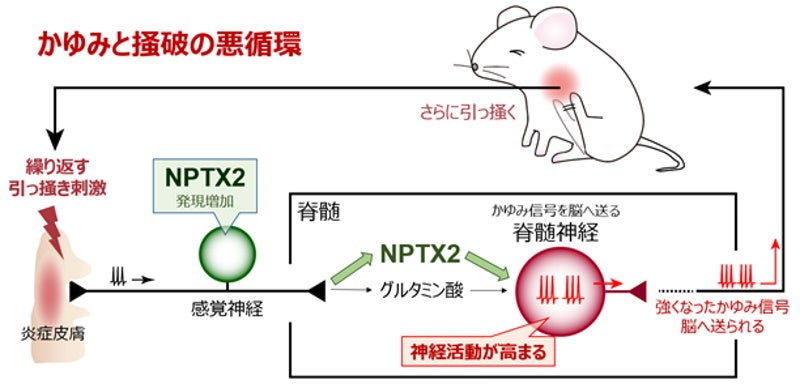 - ② 本研究では、かゆい皮膚を繰り返し引っ掻くことにより神経でNPTX2(neuronal pentraxin 2)というタンパク質が増え、それがかゆみ信号伝達神経の活動を高めてしまうことを世界で初めて発見。