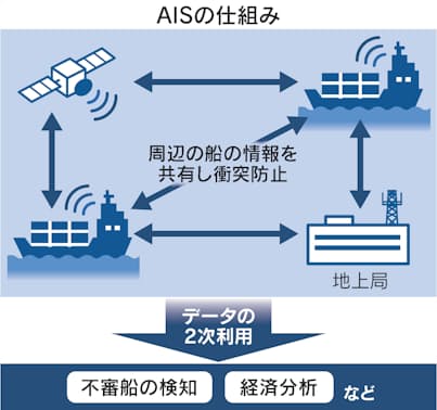 ▼AIS 船の衝突防止や運航管理のため、国際条約で大型船舶などに搭載が義務付けられた装置。周辺の船や人工衛星、地上局と情報をやりとりし、船舶固有の識別情報やリアルタイムの位置情報、目的地などを共有する。
