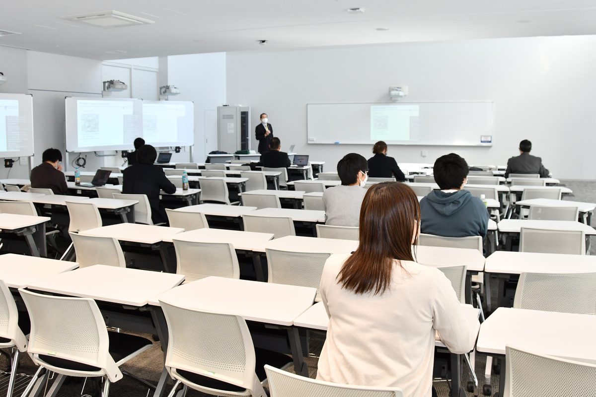当日は、初めに山口滋教授(理学部)が「波長・空間制御に優れたレーザーの応用研究」と題して講演。1964年にノーベル物理学賞を受賞したアメリカの物理学者チャールズ・タウンズとロシアの物理学者アレクサンドル・プロホロフ、ニコライ・バソフの3名による量子エレクトロニクスの基礎研究から始まったレーザー技術の歴史を紹介するとともに、日本の光産業の現状を紹介。また、分子の指紋領域と呼ばれる中赤外波長域で、光の波長と伝搬可能なフォトニック結晶の開発について解説し、「これを利用した面型量子カスケードレーザーとその検出器の素子開発を進めています。今後は、株式会社東芝と国立研究開発法人物質・材料研究機構と協力して物質検知に取り掛かる予定です。これらの研究によって、高速かつ高感度な中赤外線域の検出や波長操作のスマート化が期待できます」と話しました。さらに、研究の背景や技術的課題について語り、「レーザー研究は医療やカーボンニュートラルなどさまざまな分野に応用できます。今後も検討を重ねていきたい」とまとめました。