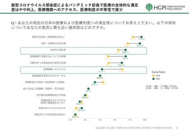 日本の医療の全体的な満足度を尋ねる項目において66.9%が満足(「大いに満足」および「満足」を合計)と回答。新型コロナウイルス感染症(COVID-19)パンデミック前に当機構で実施した2019年調査の62.0%と比較し微増(62.0%→66.9%)